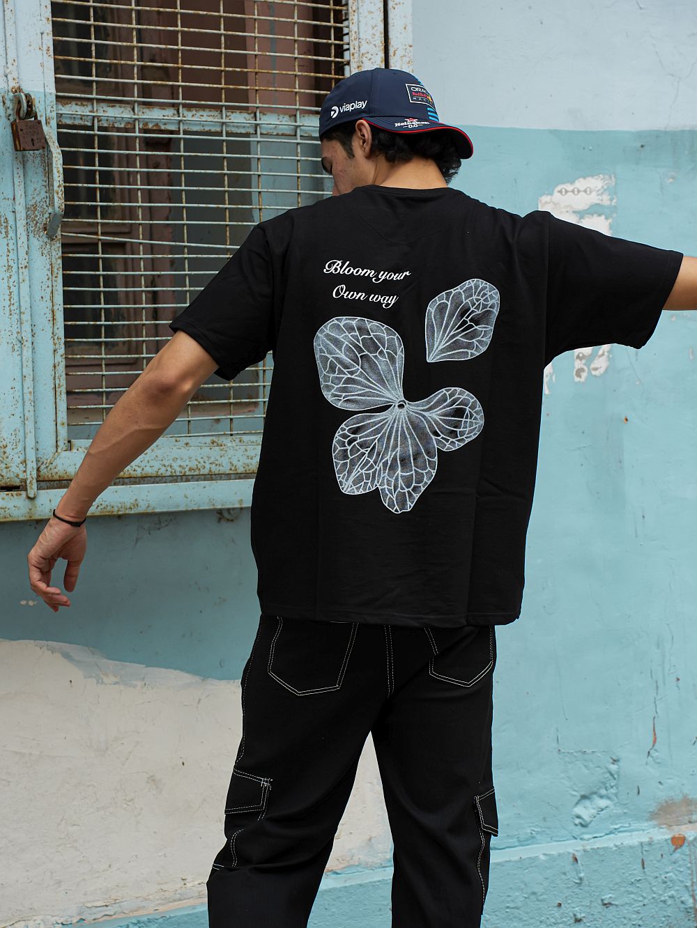This tee features abstract floral wings in soft linework forming a butterfly-like silhouette — symbolic of personal growth, transformation, and individuality. The message “Bloom your own way” floats above the design as a quiet affirmation for those carving their own path.