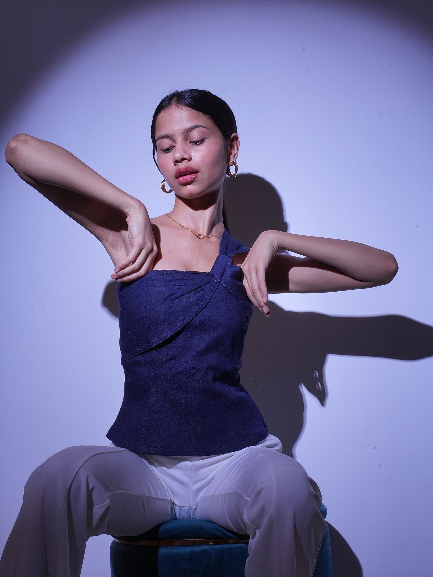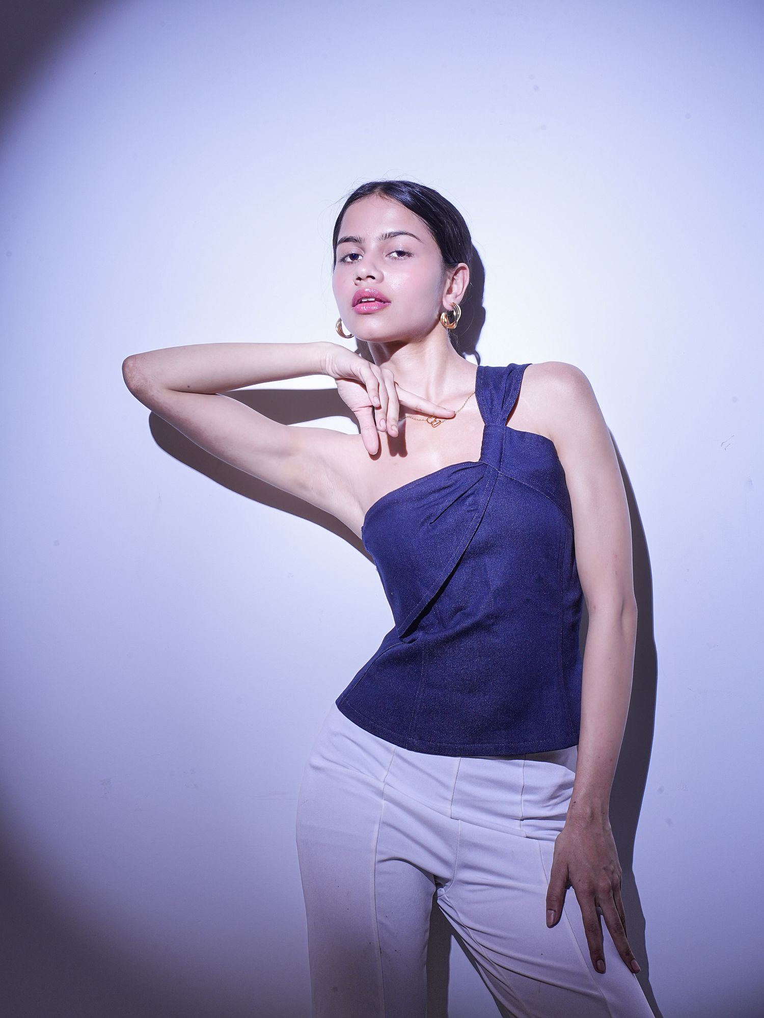 Sculpted, sleek, and undeniably bold — the peek-a-blue top is a modern take on denim. Featuring a dramatic one-shoulder silhouette with a twisted strap detail, this top redefines power dressing with a feminine edge. Made from soft stretch denim, it contours your body like a dream while still allowing effortless movement. Perfect for nights out or statement daywear, this piece is made to command attention.
