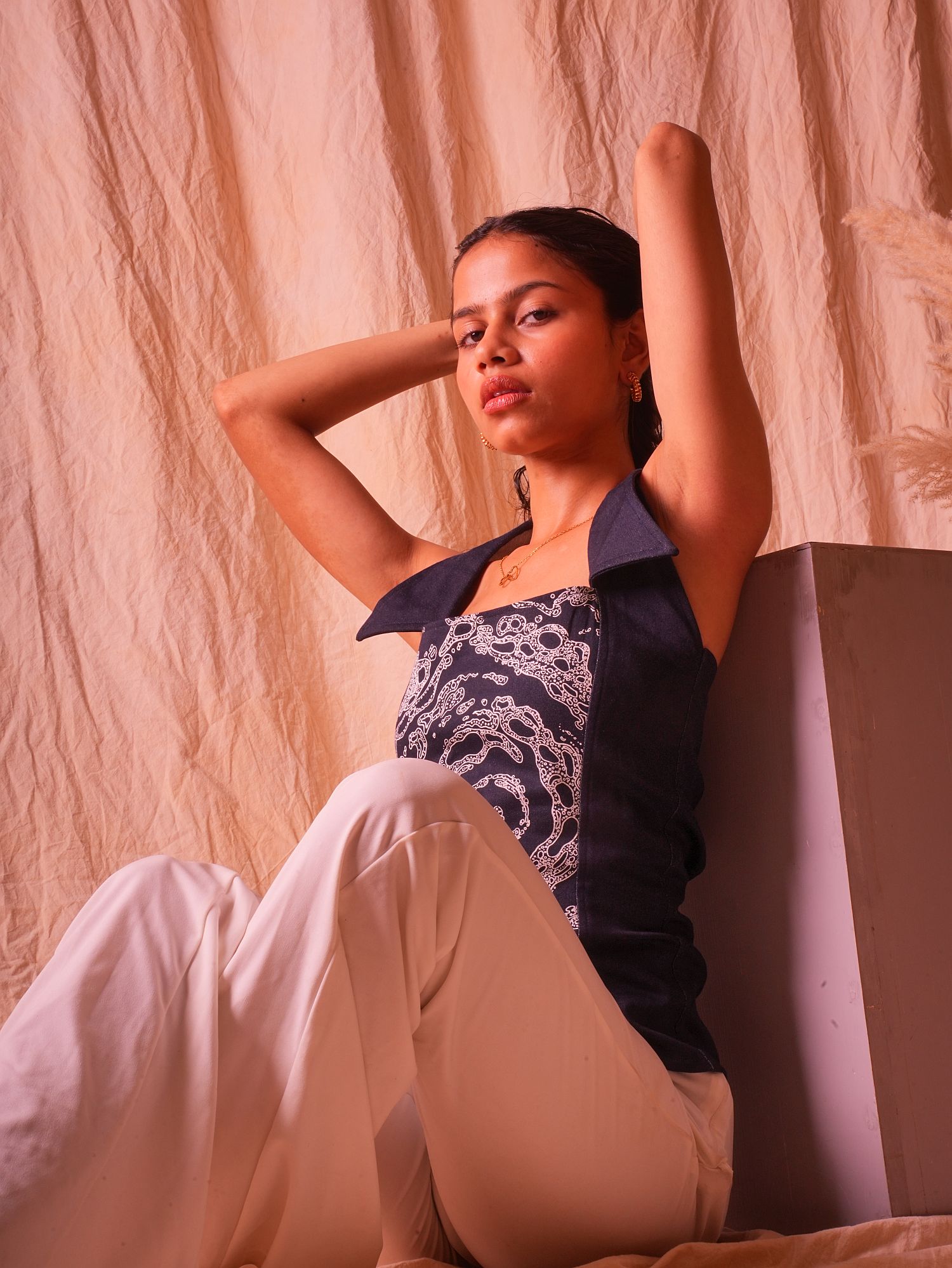 Meet the Swirl Dream halter Top — where structure meets statement. Crafted in soft yet structured denim, this sleeveless top is designed to turn heads with its bold, abstract white swirl screen print that runs artistically across the front. The flattering panel construction hugs the body perfectly, while the open collar detail adds a modern, edgy twist.