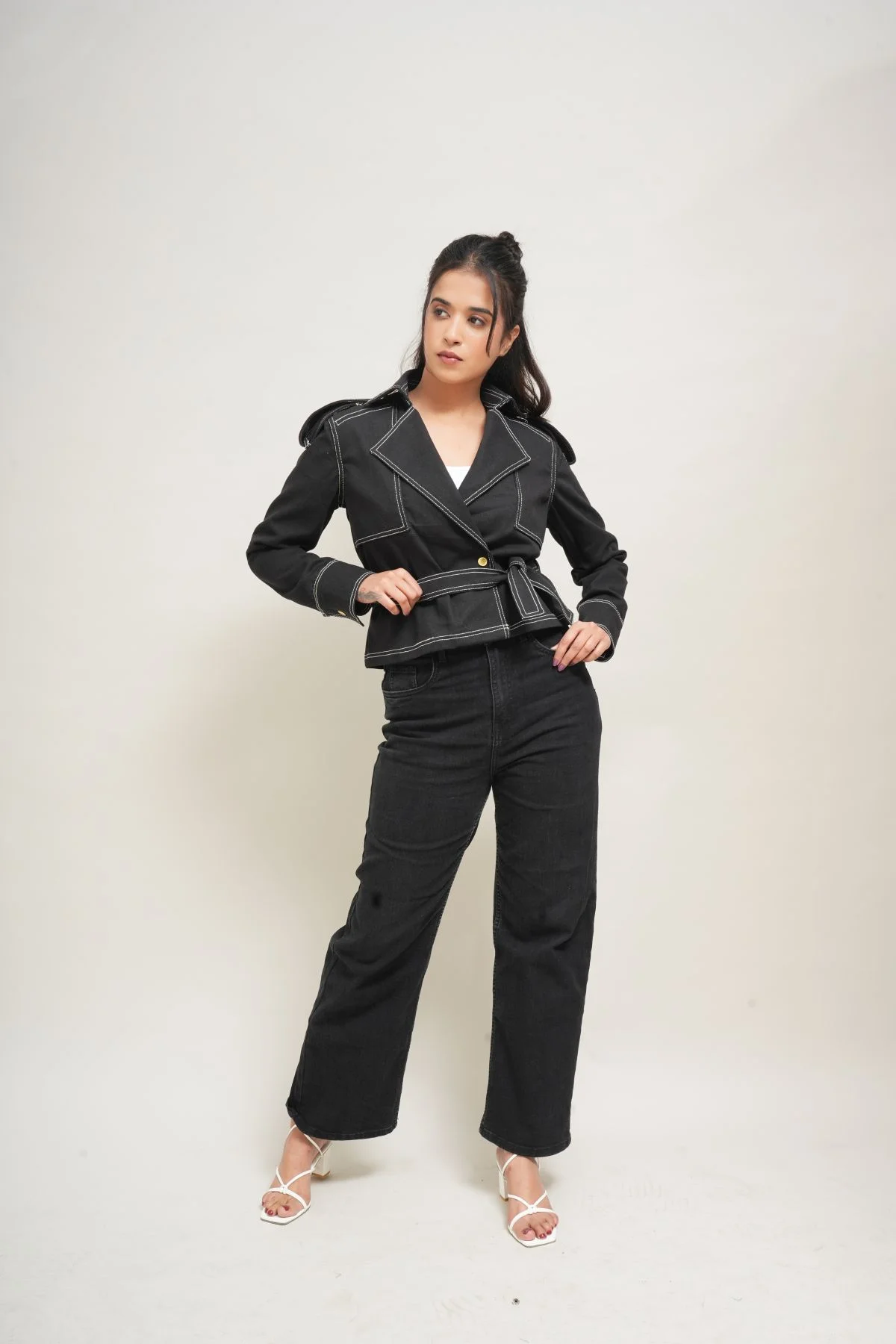 Elevate your everyday style with The Gia Jacket—crafted in premium black denim and highlighted with bold white contrast stitching. Designed with a flattering wrap silhouette, structured lapel collar, and a tie-up belt that cinches the waist beautifully, this piece blends feminine shaping with a modern, edgy finish.