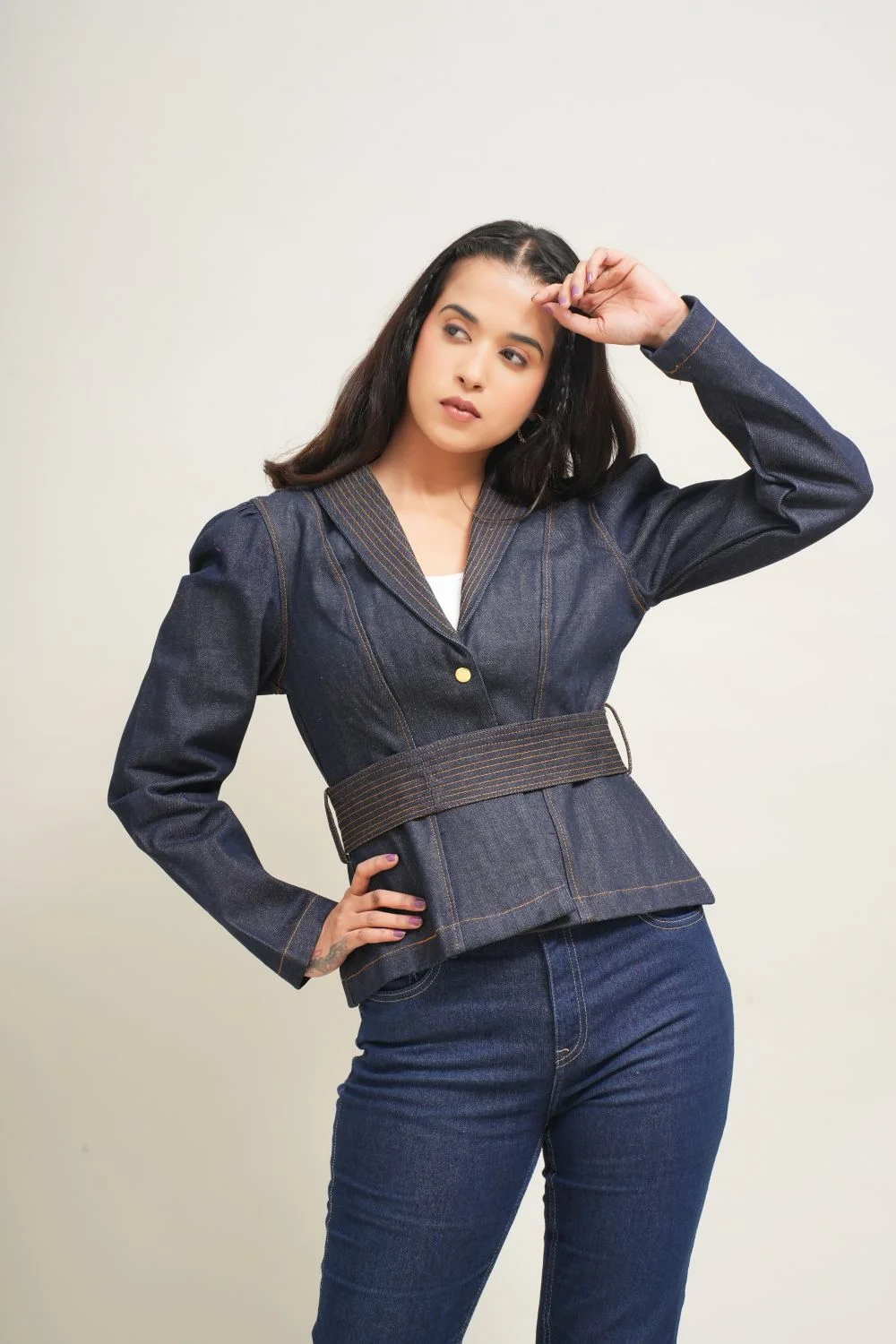 A chic indigo denim tailored jacket featuring a structured fit, cinched waist belt, soft puffed shoulders, and contrast stitching. Designed to elevate everyday style with a clean, modern silhouette.