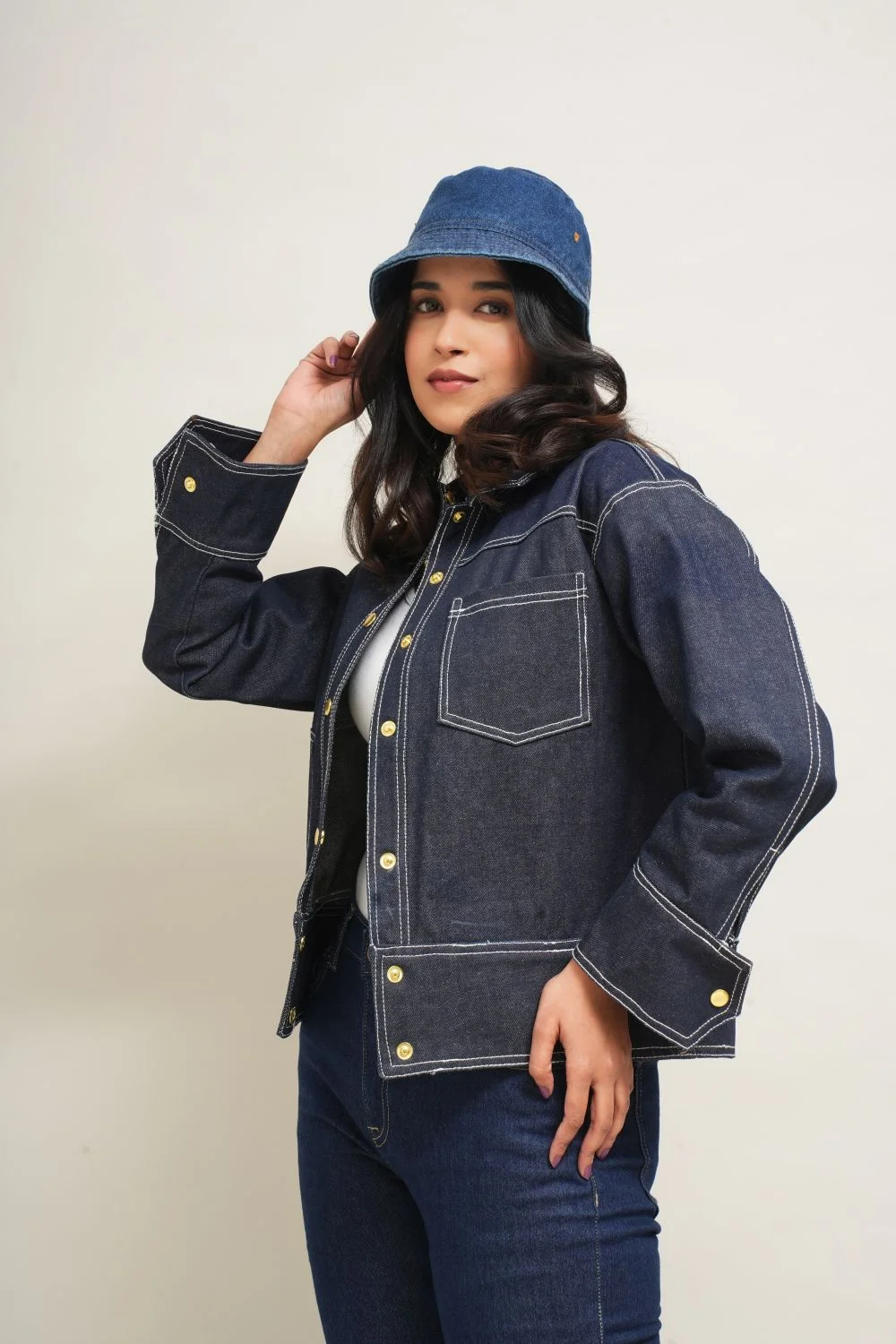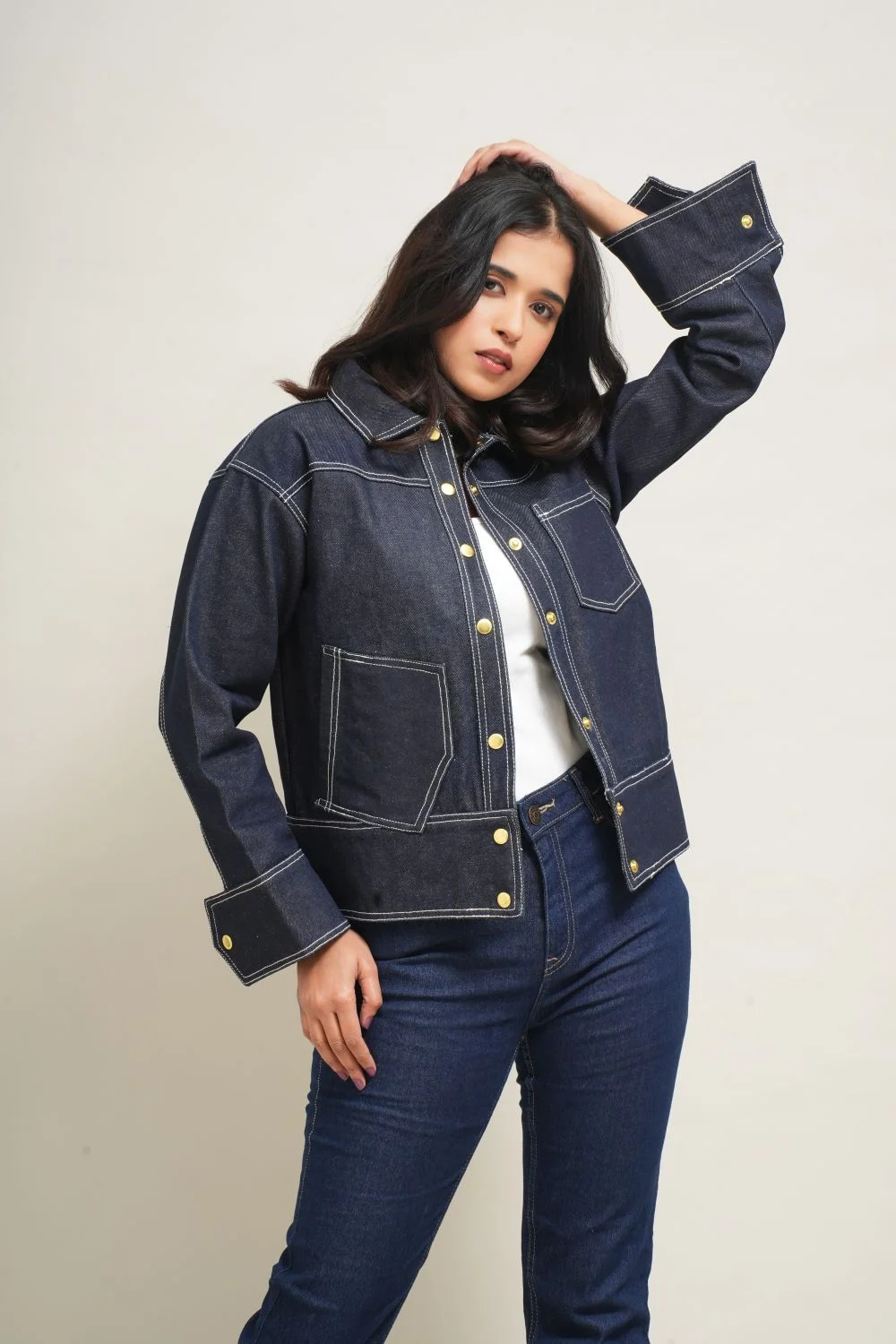 Meet The Tessa Jacket—crafted in rich indigo denim and elevated with striking white contrast stitching. Designed with a structured silhouette, statement patch pockets, and bold cuff detailing, this jacket brings a modern, fashion-forward twist to a timeless classic. Finished with premium gold buttons, it’s the perfect layer for chic everyday styling.